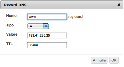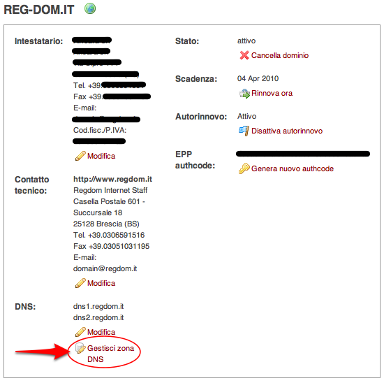Per i partner che si avvalgono dei nostri name server dns1.regdom.it e dns2.regdom.it (N.B.: utilizzabili anche come dns1.propriodominio.tld e dns2.propriodominio.tld), è presente in ogni scheda dominio una nuova voce “Gestisci zona DNS” a fondo pagina (immagine 1).
