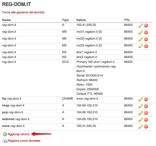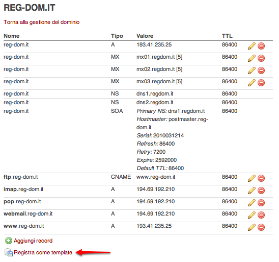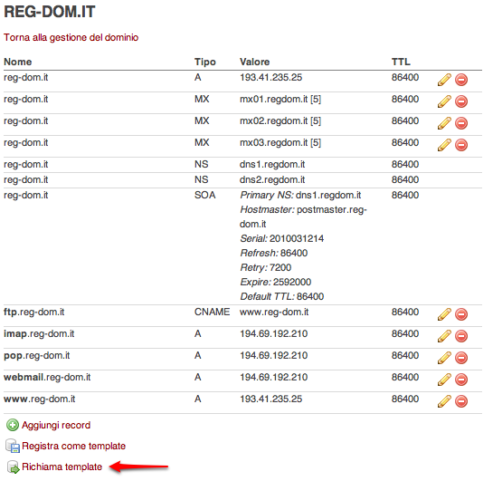 Infine il template è richiamabile dalla gestione dns di ogni dominio tramite l’opzione “Richiama template” a fondo pagina (immagine 6).